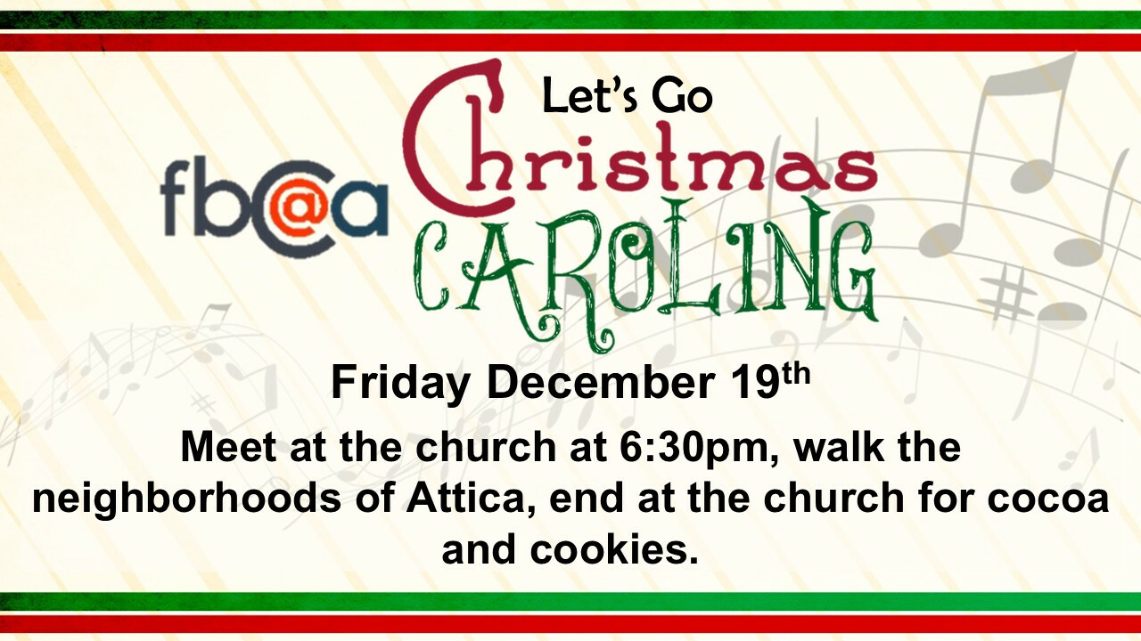 Join us in bringing the JOY to our neighborhood. We meet at FBC@Attica Fellowship hall and return for refreshments-and to warm back up.